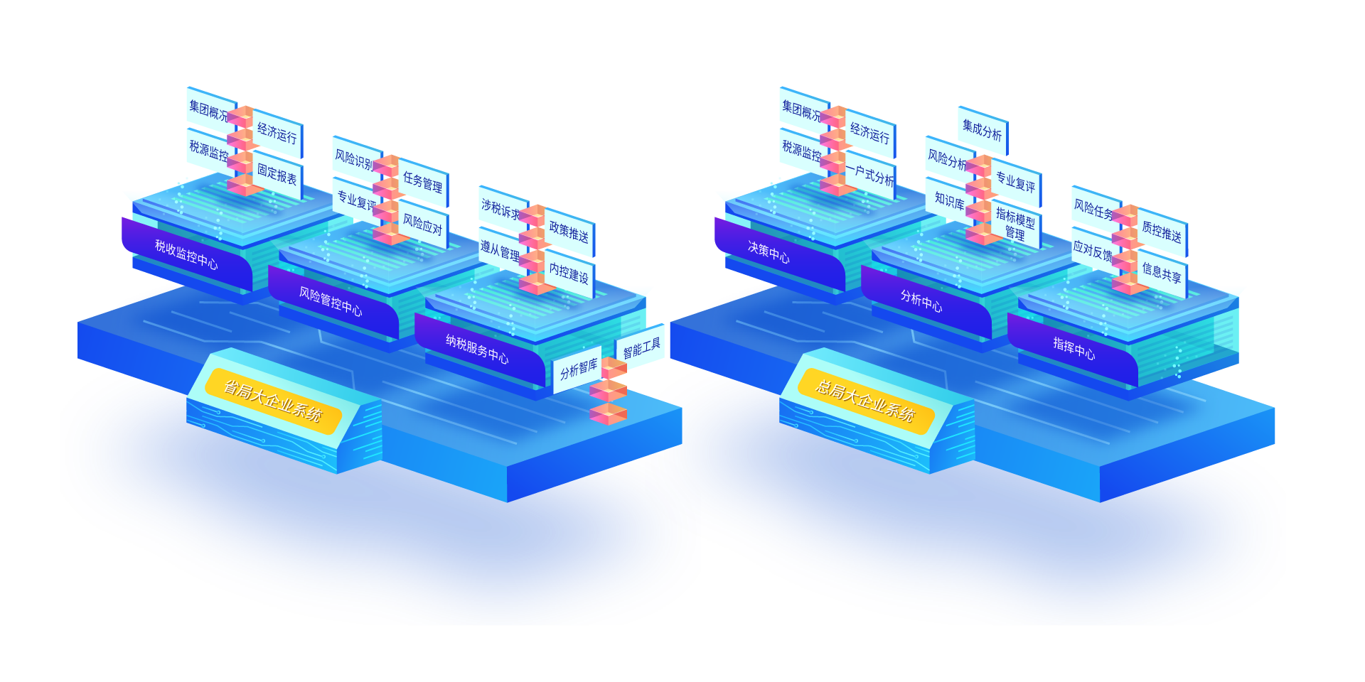主要功能:包括稅收監(jiān)控中心、風(fēng)險(xiǎn)管理中心、納稅服務(wù)中心,以及支撐三個(gè)中心的智能工具和分析智庫(kù)。
