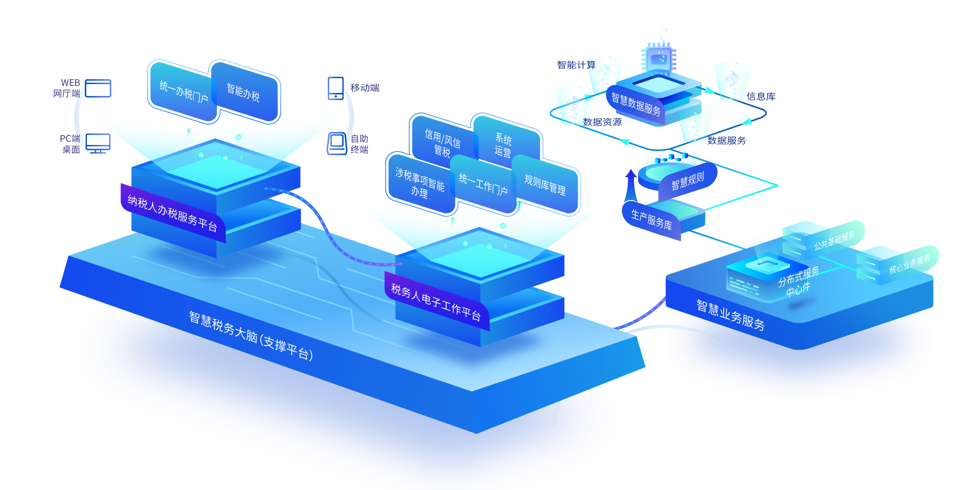 貫穿傳統(tǒng)網(wǎng)站、電腦桌面、智能手機(jī)、自助終端的智慧稅務(wù)平臺(tái),通過智慧業(yè)務(wù)服務(wù)平臺(tái)和智慧數(shù)據(jù)服務(wù)中臺(tái)支撐智慧化的納稅人辦稅平臺(tái)、稅務(wù)人電子工作臺(tái),為納稅人、稅務(wù)人員、社會(huì)公眾和中介機(jī)構(gòu)服務(wù)。